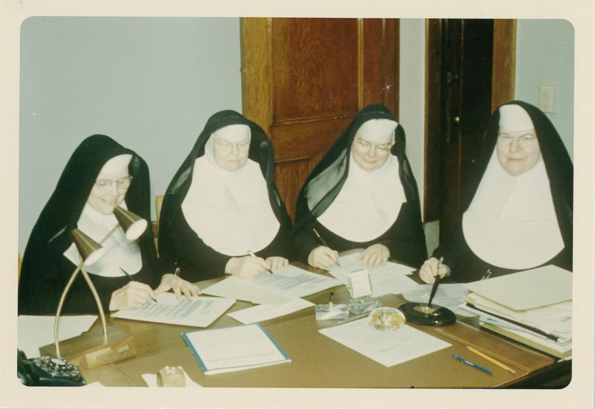 Descripción: La fotografía muestra a las primeras hermanas con cargos en la Federación de las Hermanas de la Misericordia. De izquierda a derecha: Madre Mary Bernard Graham, Congregación de Filadelfia, Secretaria; Madre Mary Patrick McCallion, Congregación de North Plainfield, Tesorera; Madre Mary Thomas Aquinas Carroll, Congregación de Pittsburgh, Presidenta; Madre Mary Regina Cunningham, Unión de Bethesda, Vicepresidenta