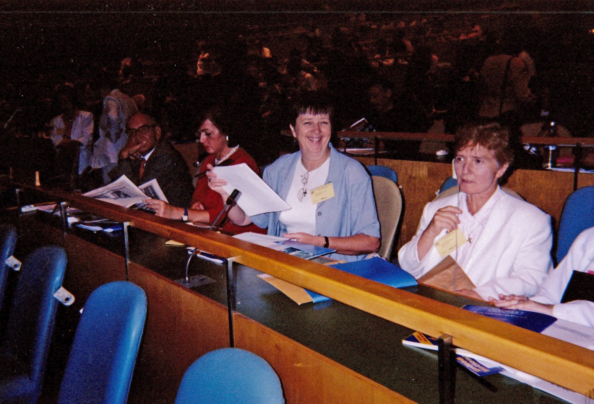 Descripción: Delegadas de la Misericordia en el Salón de la Asamblea General de la Conferencia de las Organizaciones No Gubernamentales de las Naciones Unidas. Foto: Eileen Hogan, RSM y Carmel Crimmins, RSM.