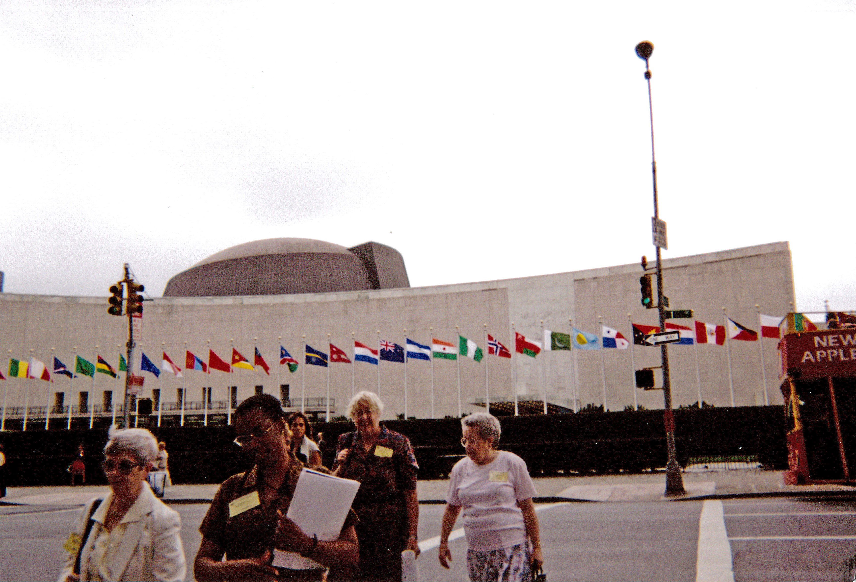 Descripción: Aileen Flynn, Mayon Sylvain, Joan McKeon y Dot Flynn en camino a la oficina de Compromiso Global de la Misericordia en el edificio Church Center en 44th St. y 1st Ave.