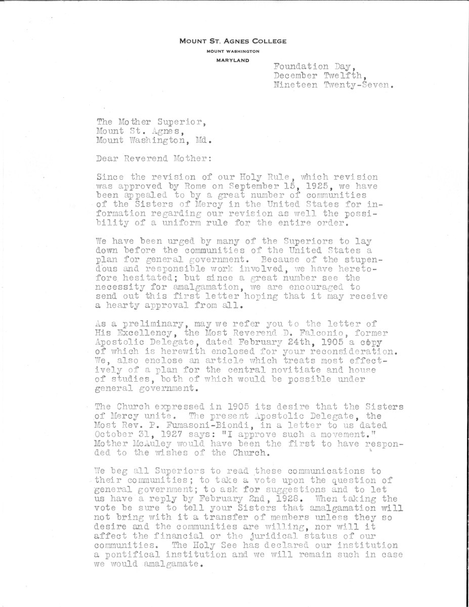 Descripción: Esta carta, escrita por la Madre Mary Carmelita Hartman, fue enviada a cada comunidad de la Misericordia en Estados Unidos solicitando a las Madres Superiores que estudiaran la posibilidad de adherirse a ella en la formación de un gobierno general para todas las Hermanas de la Misericordia en el país.