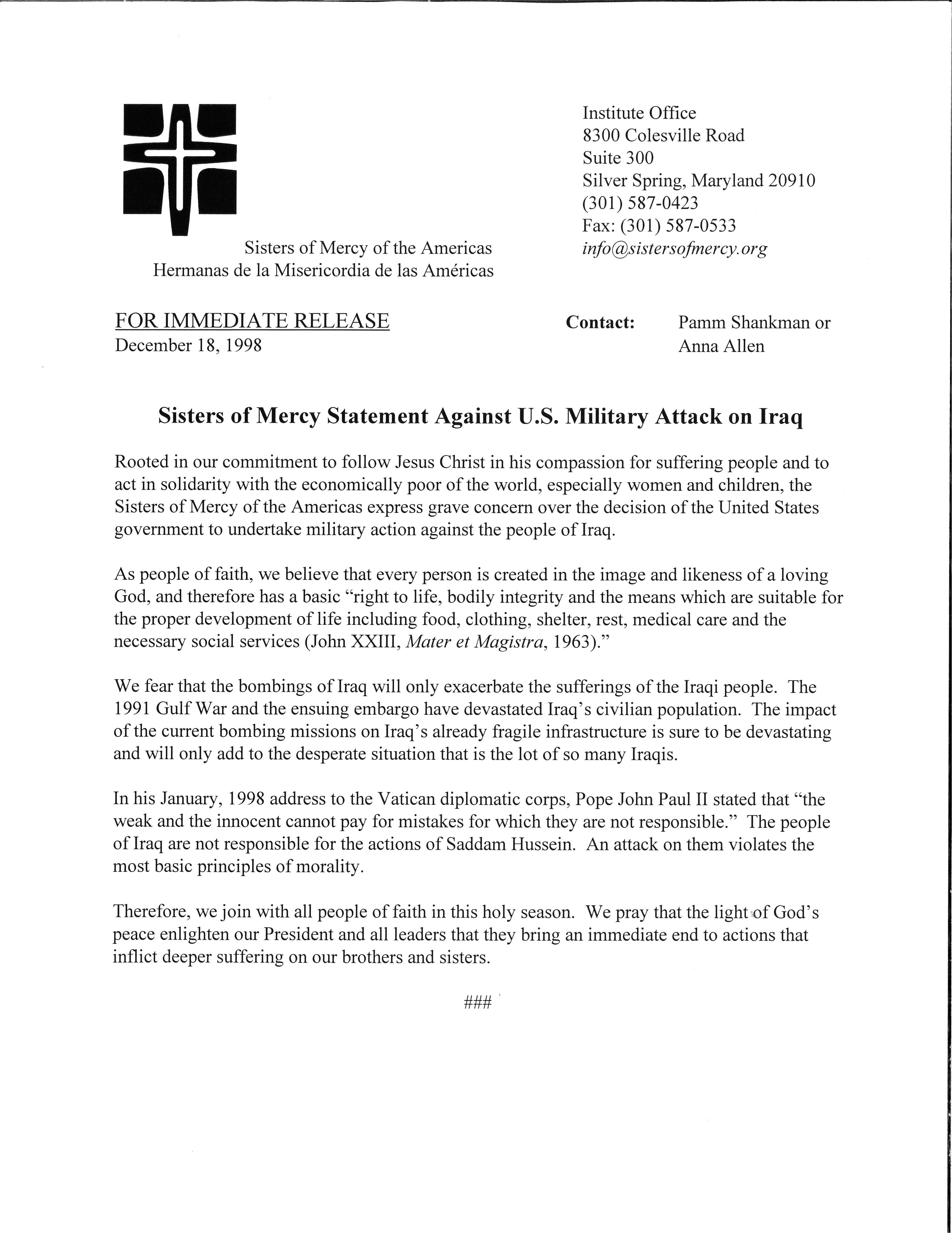 Título: Declaración de las Hermanas de la Misericordia Contra el Ataque Militar de EE.UU. en Irak