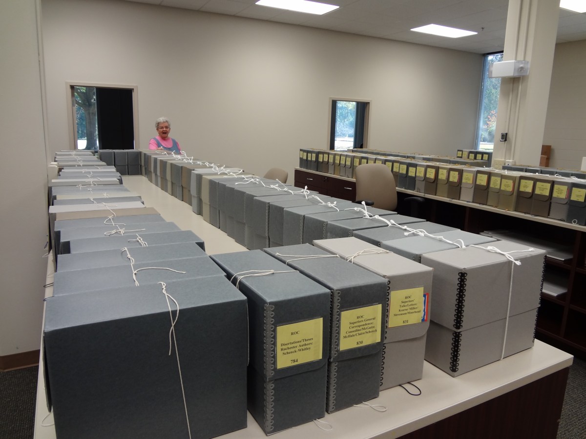 Descripción: La archivista de la antigua Comunidad Regional, Hermana Jeanne Reichart, inspecciona la Colección de la Comunidad Regional Rochester en la sala de proceso del Centro de Herencia de la Misericordia.